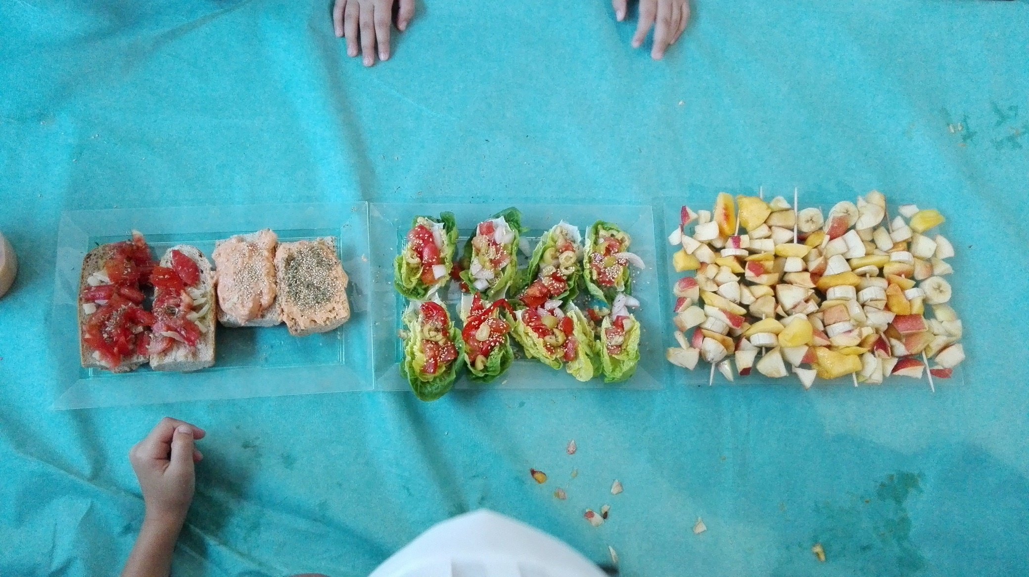 En la segunda parte, los dividimos en grupos de 3-4 y elaboraron tres recetas saludables: ensalada o varquitos de ensaladas, brochetas de frutas de temporada y tostadas de queso y tomate y de hummus de pimiento